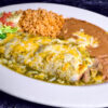Served with Spanish rice and refried beans or black beans.